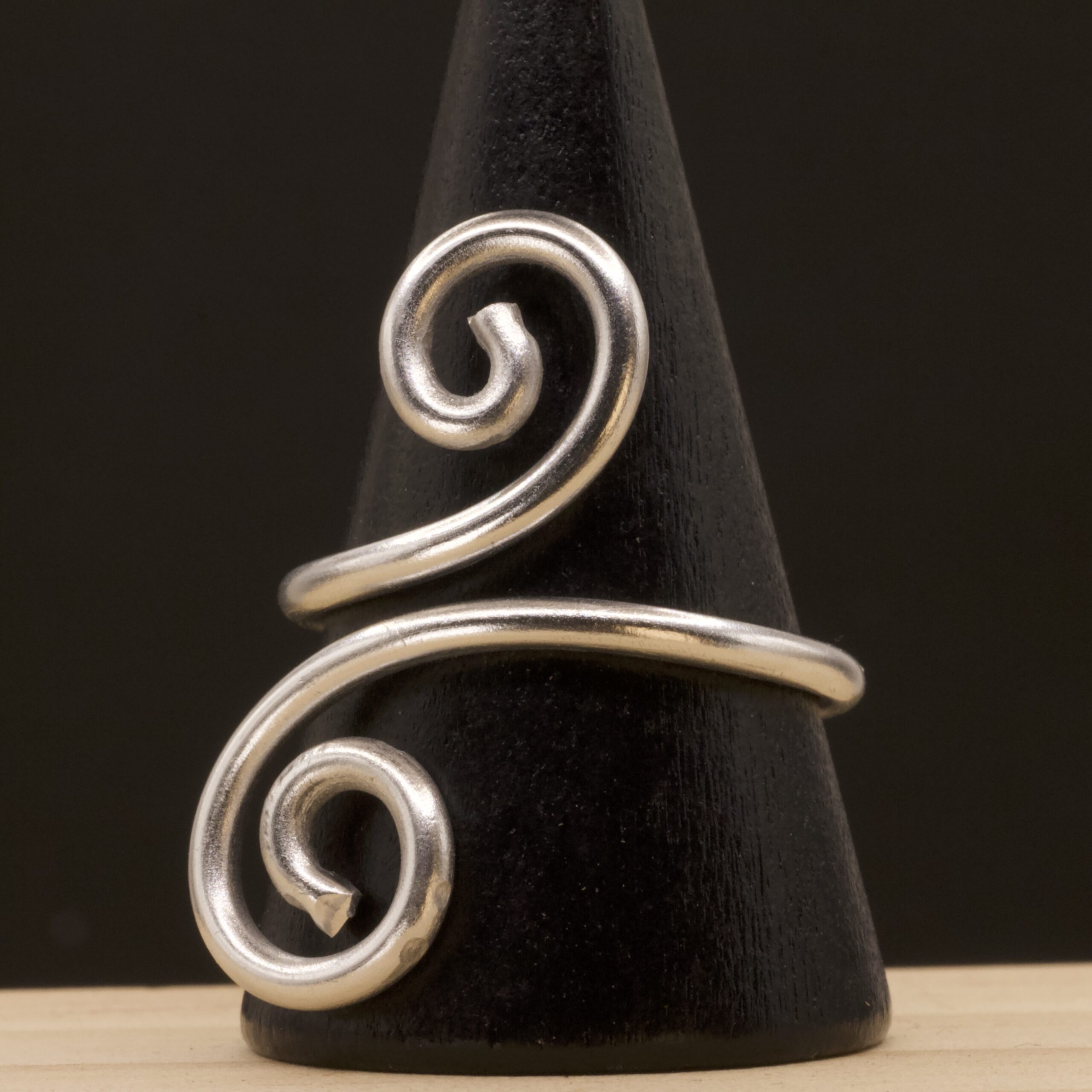 Questo anello è realizzato a partire da un’unica striscia di alluminio lavorata a mano, curvata fino a disegnare due spirali sovrapposte collegate da una fascia centrale liscia. La struttura segue la lunghezza del dito, creando un effetto slanciato ma comunque minimal, senza pietre o dettagli aggiuntivi.