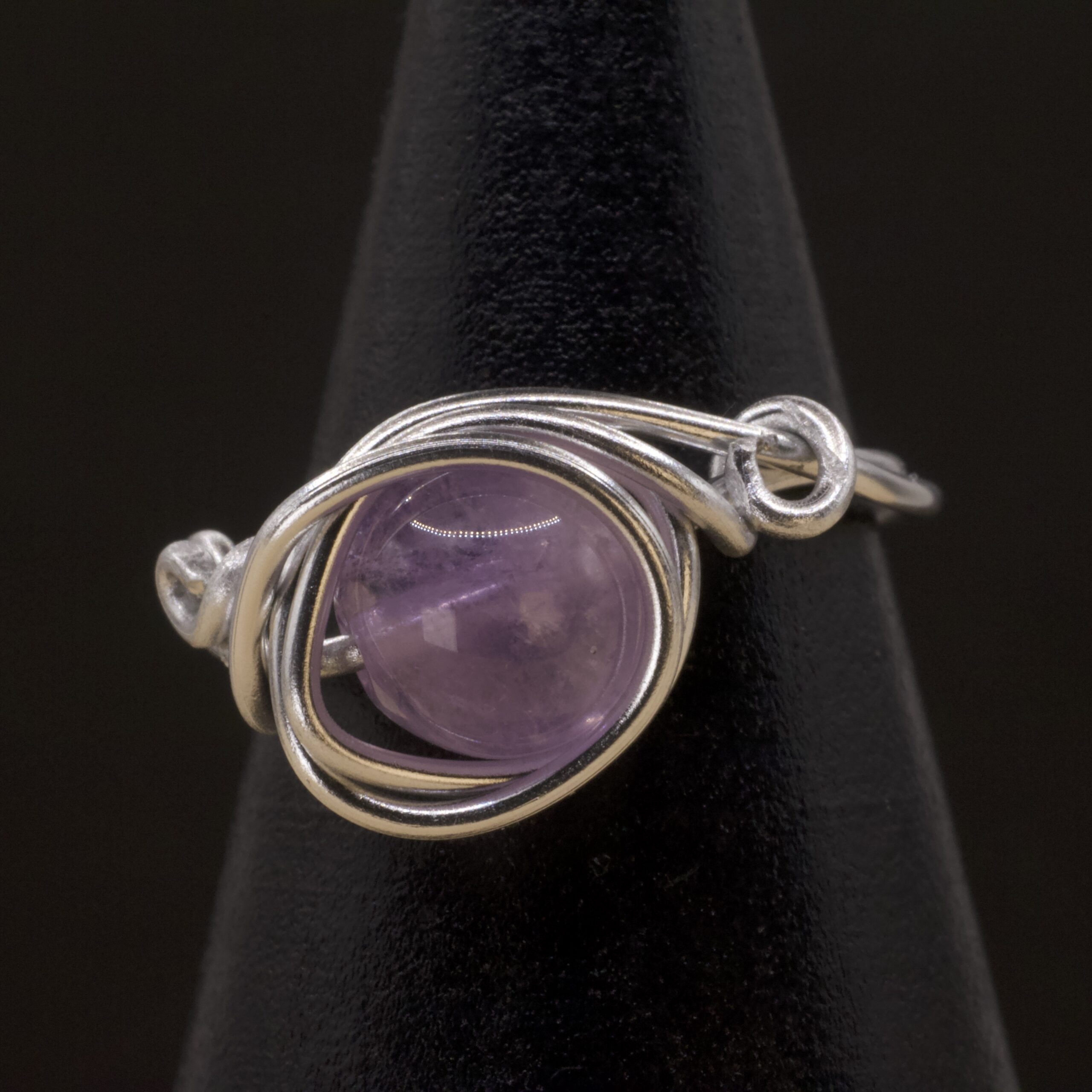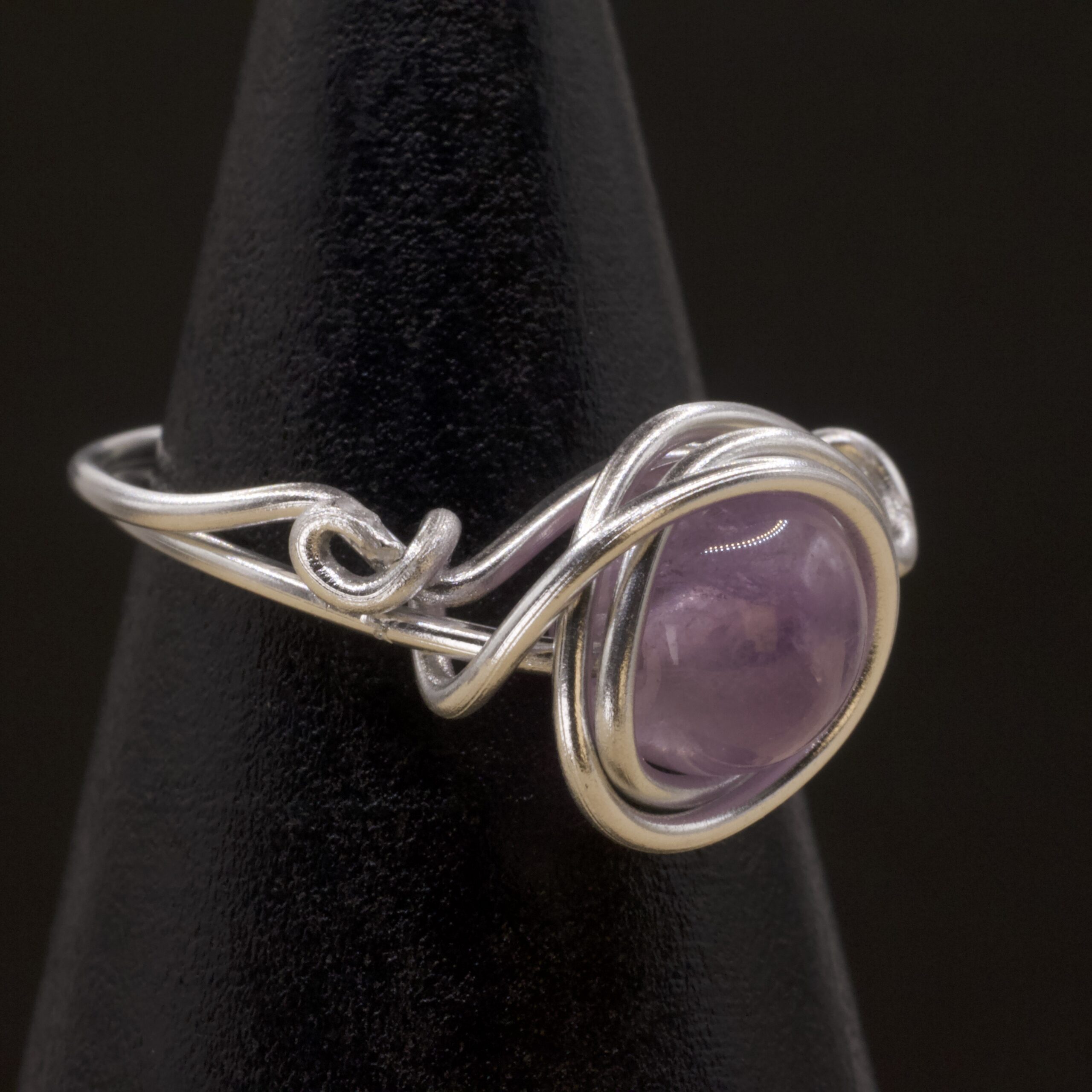 Un anello in filo argento intrecciato che abbraccia una sfera di ametista lavanda, dal viola chiarissimo e delicato. Un dettaglio soffice e luminoso, pensato per chi ama i toni pastello e una calma discreta sempre al dito.