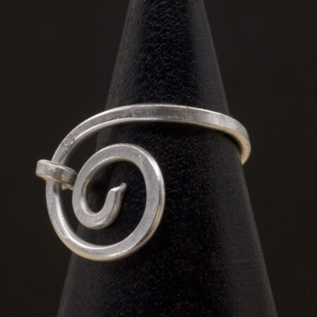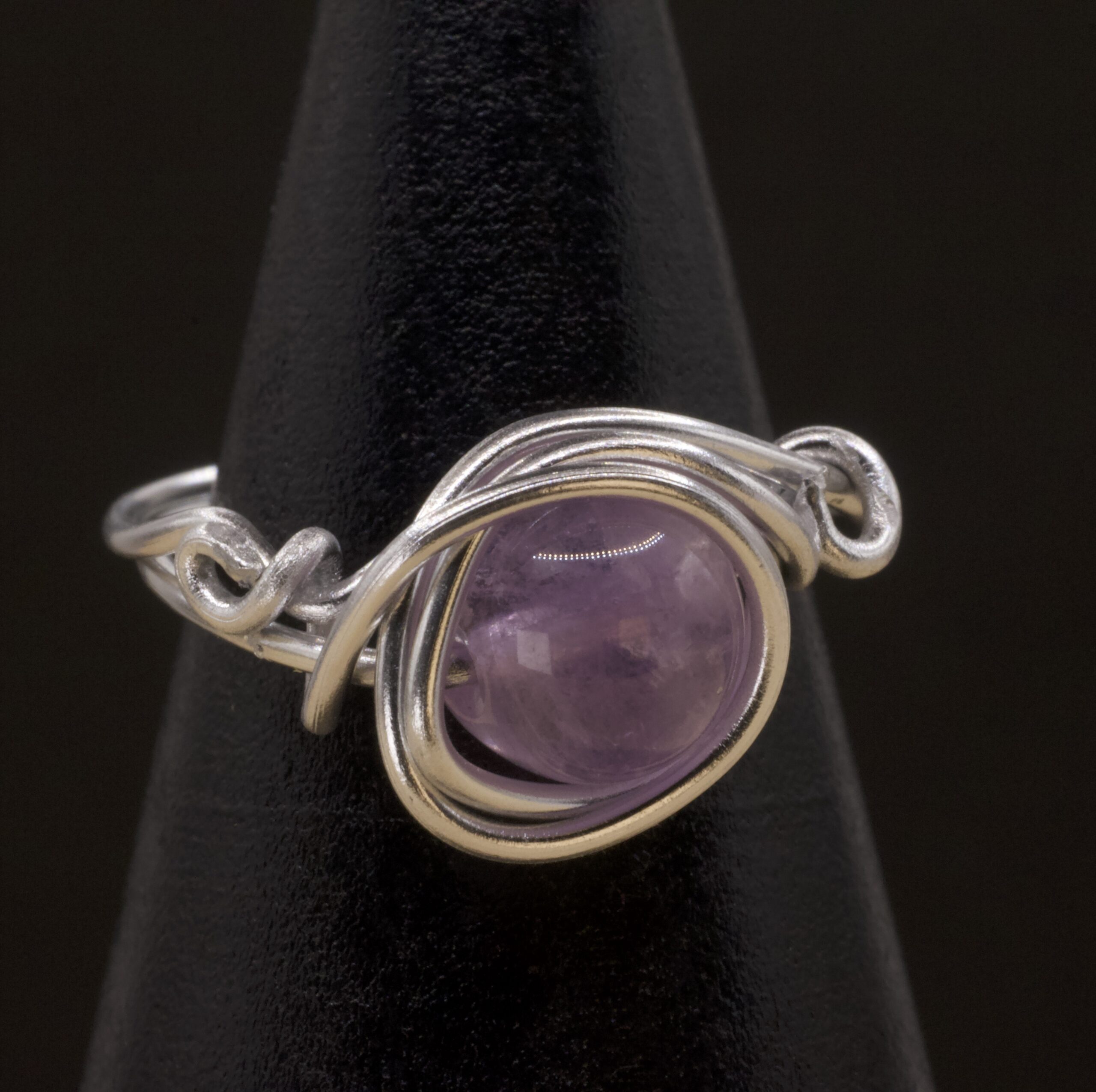 Questo anello nasce da più fili color argento che si avvolgono attorno all’ametista lavanda creando una piccola culla intrecciata. Le linee si sovrappongono e si rincorrono, fino a chiudersi in una montatura morbida che lascia la pietra ben visibile. Il viola chiarissimo della sfera è quasi trasparente: una tonalità pastello che si accende solo quando incontra la luce.