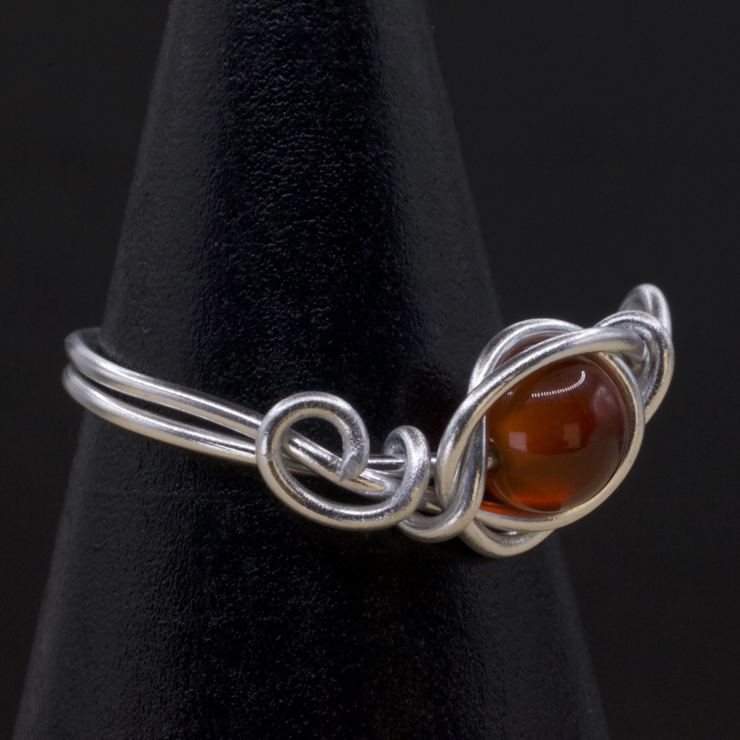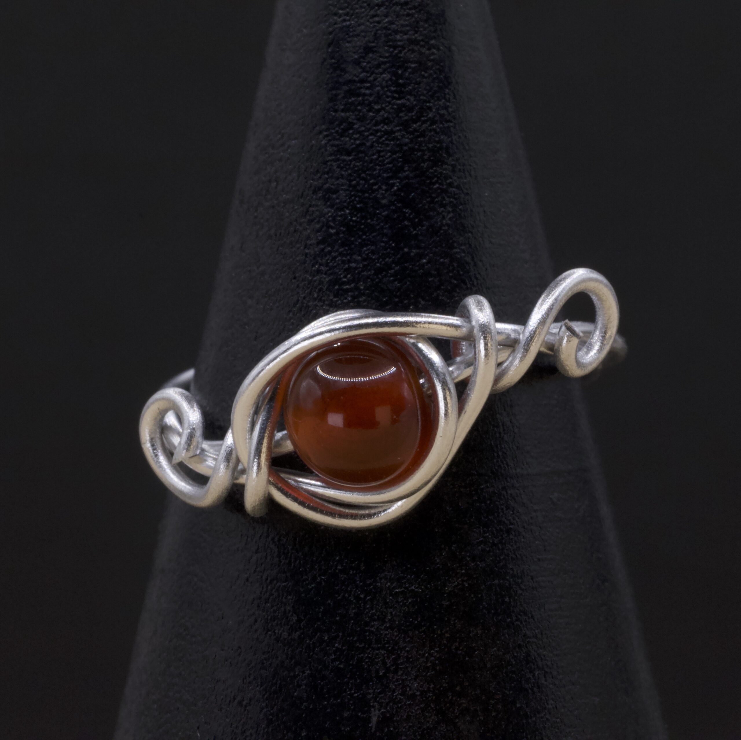 Un anello in filo color argento che abbraccia una sfera di corniola dal rosso profondo. Un dettaglio essenziale ma deciso, perfetto per chi vuole un tocco di energia calda sempre al dito.