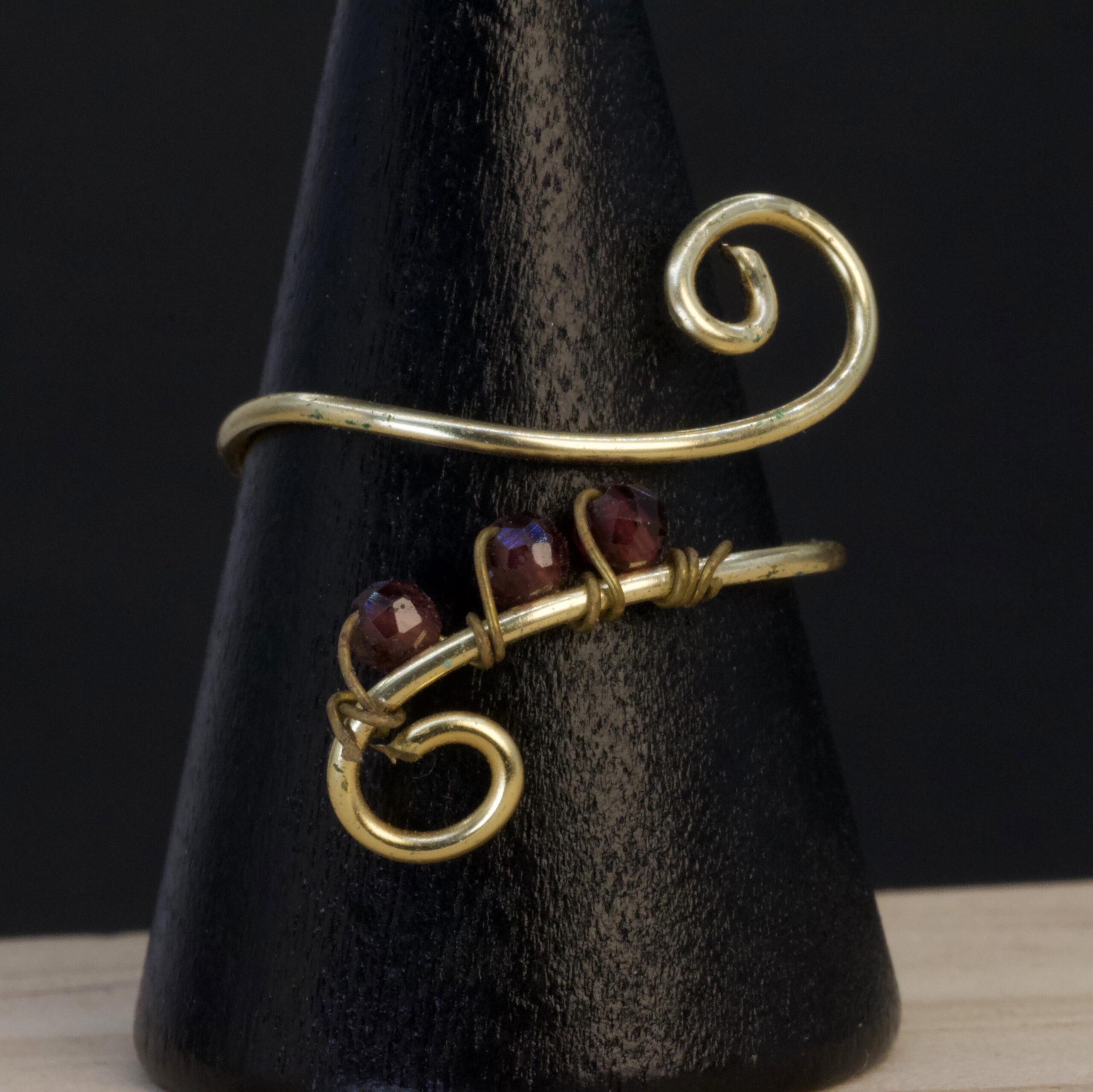 Questo anello nasce da un filo di rame color oro modellato in una spirale verticale che corre lungo il dito. Sulla fascia frontale si allineano tre granati naturali, piccole sfere sfaccettate dal rosso profondo, fissate con micro-avvolgimenti che ne seguono la curva.
