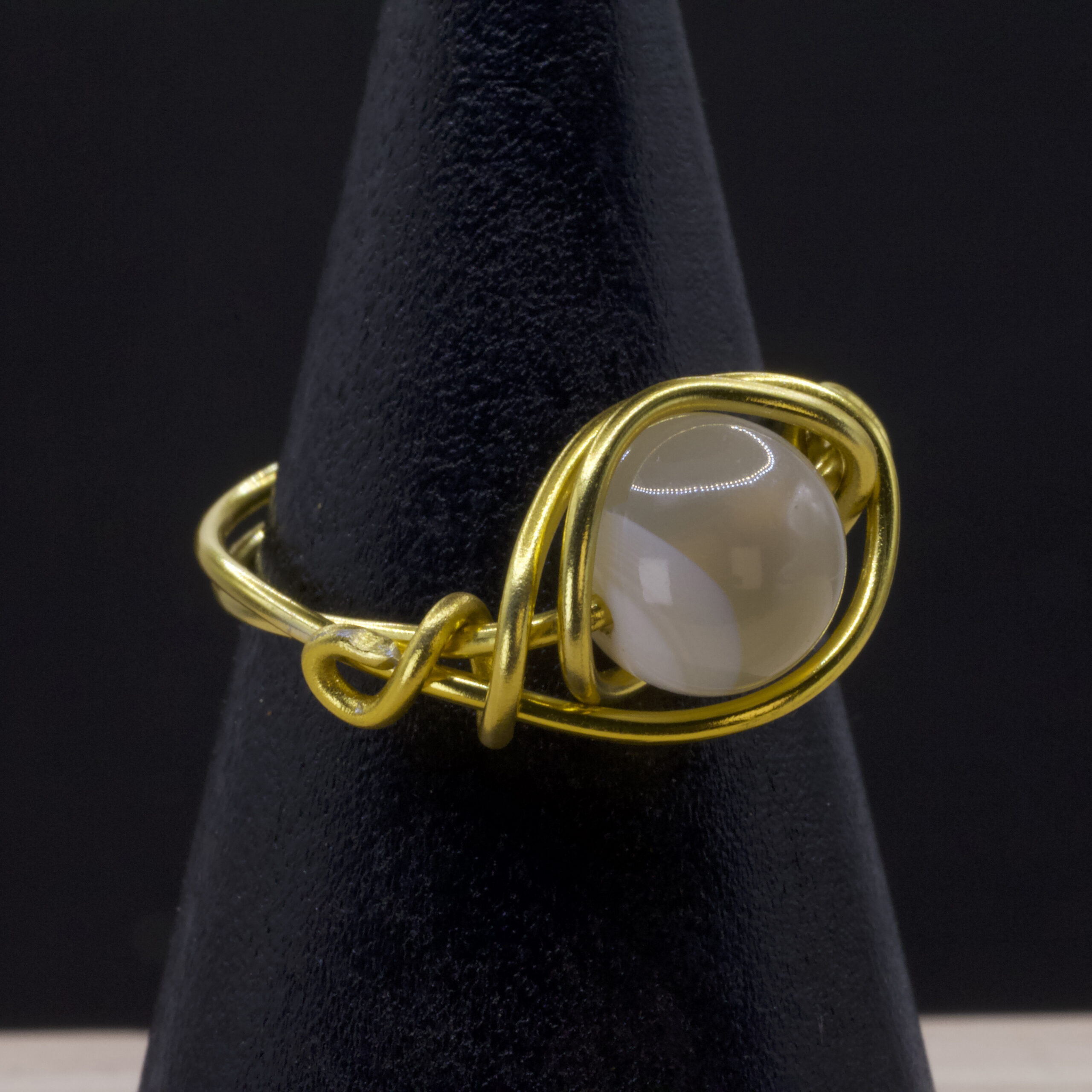 Un anello luminoso in filo oro che avvolge una sfera di agata Botswana dai toni crema e grigio morbido. Un piccolo talismano elegante, perfetto per chi cerca calma, centratura e uno stile essenziale ma ricercato.