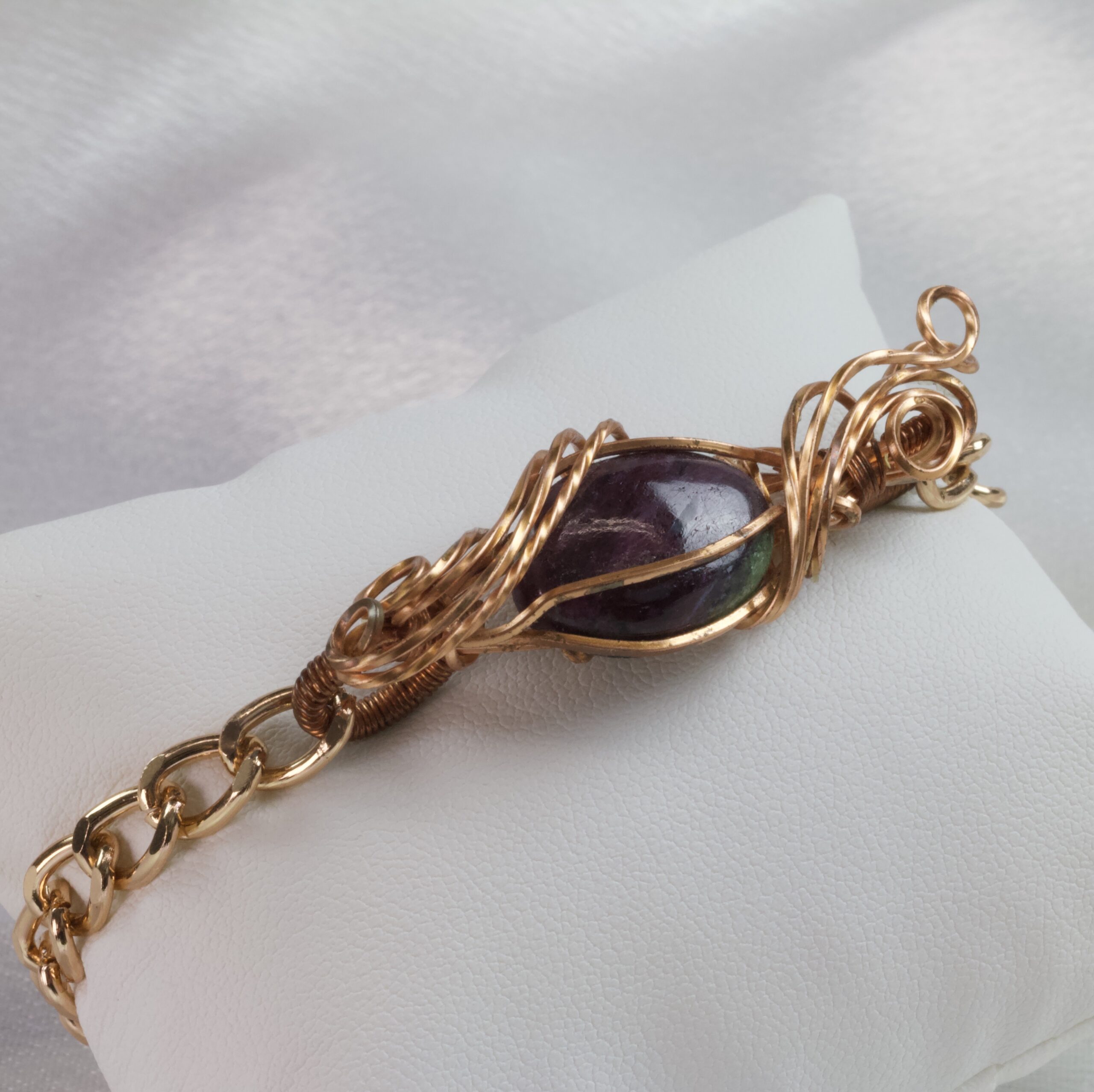 Una goccia di zoisite rubino, attraversata da sfumature viola e verdi, avvolta da un intreccio caldo di rame dorato. Un bracciale che unisce dolcezza e forza, pensato per chi vuole tenere al polso un richiamo costante a ciò che ama davvero, restando ben radicata a terra.
