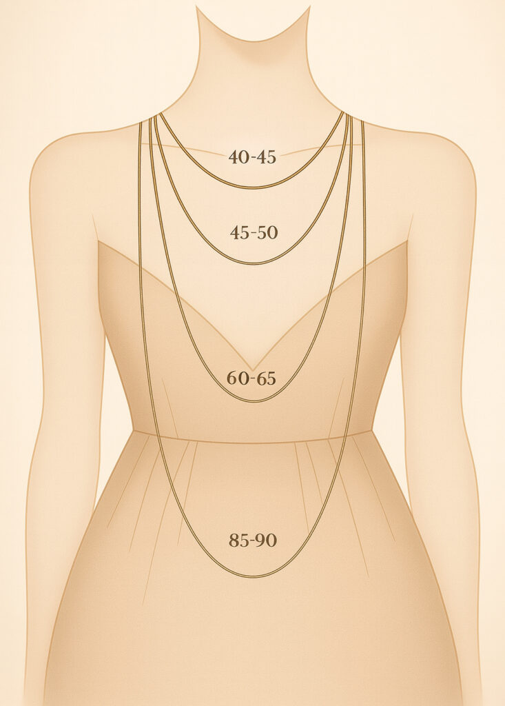 Per le collane non esiste uno standard assoluto, ma vengono usate delle lunghezze di riferimento che aiutano a capire dove cadrà la collana sul corpo.