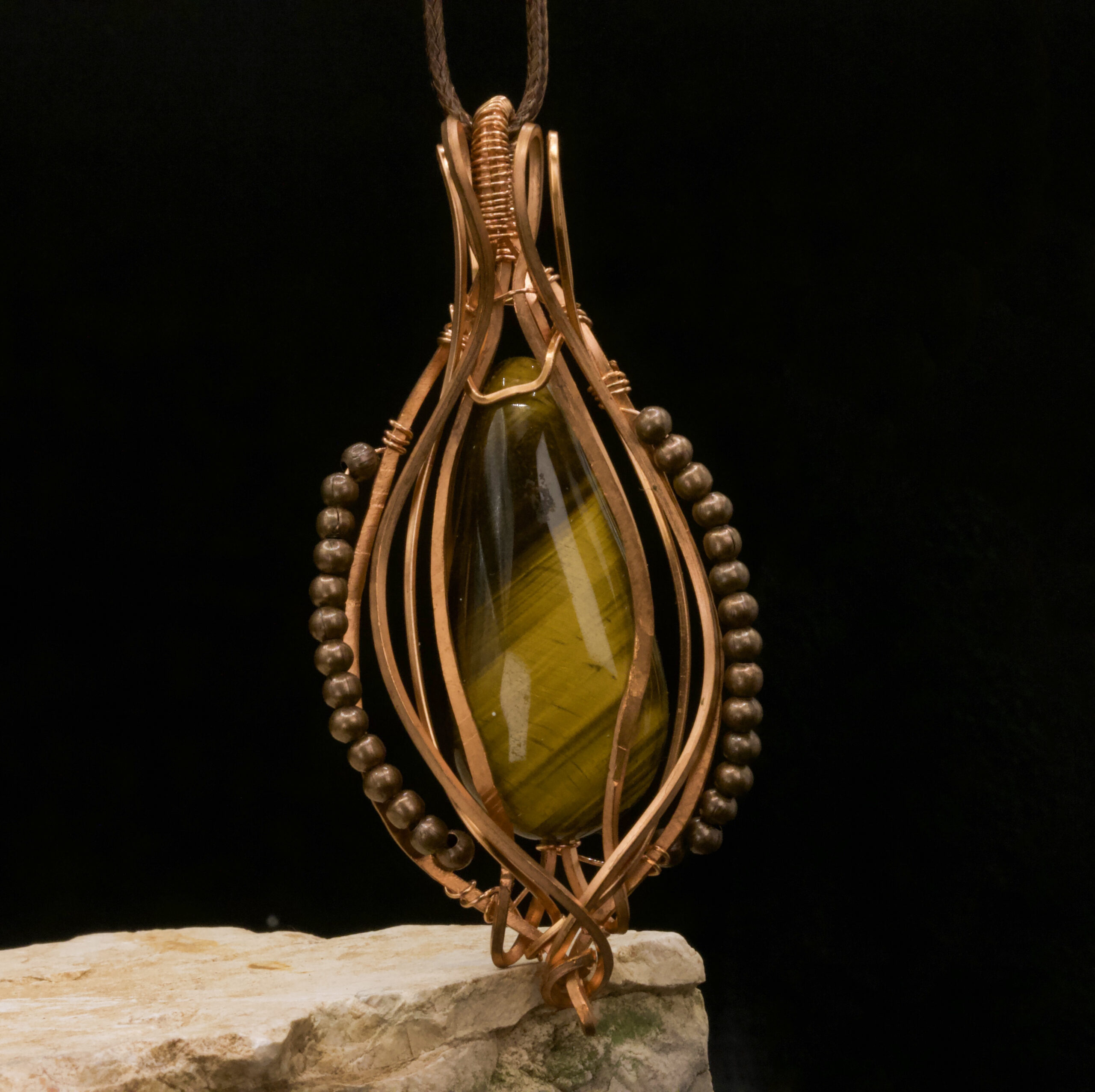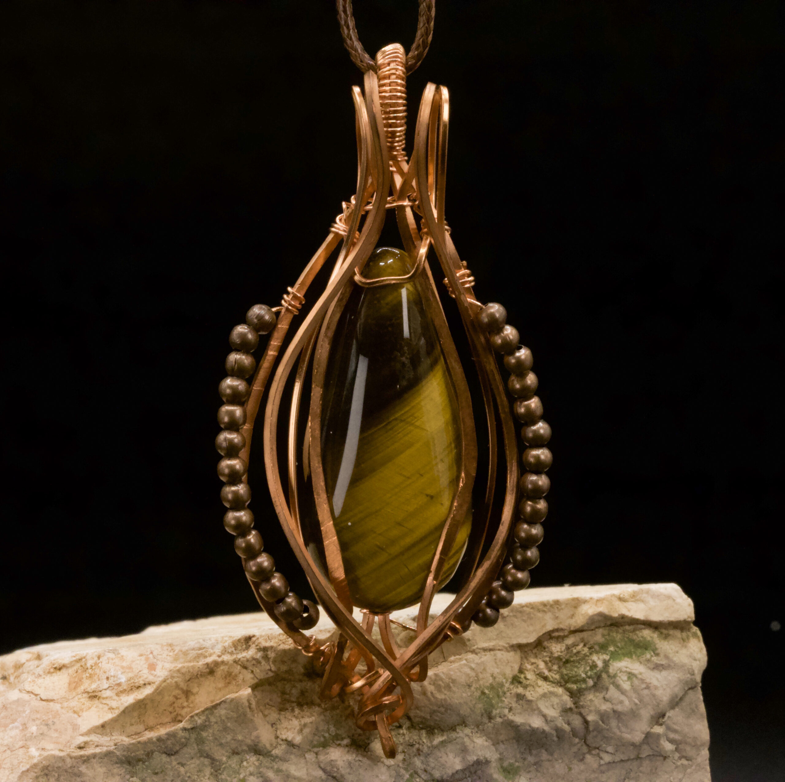 Un pendente caldo e deciso: l’Occhio di Tigre cattura la luce come ambra viva, incorniciato da un intreccio in rame che lo protegge e lo mette in risalto.