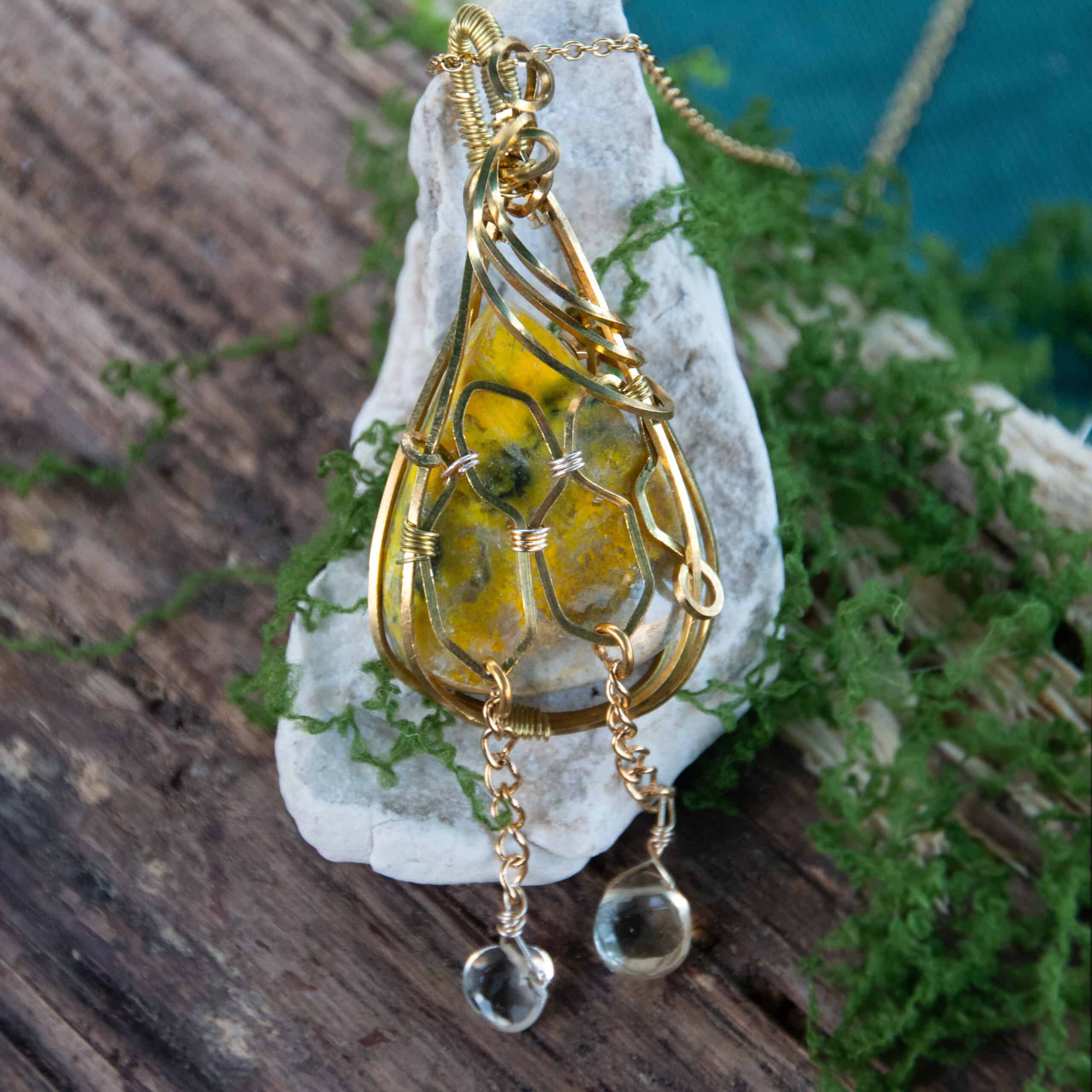 Un omaggio al bumblebee, custode operoso dei fiori e simbolo di comunità e vitalità. Il design di questa collana richiama le celle esagonali del miele e custodisce un cuore solare in diaspro bumblebee, una pietra rara e potente. Le due gocce mobili in quarzo citrino, leggere e dorate, scivolano come stille di miele puro.
