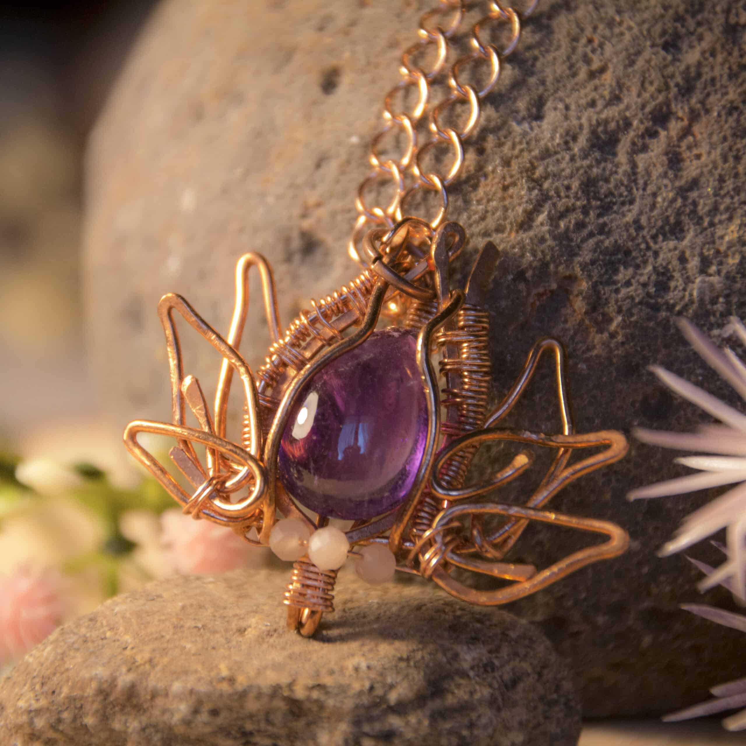 Una goccia d’ametista abbracciata da ali di rame e petali intrecciati, con piccole adularie come rugiada. Questa collana evoca rinascita, saggezza e visione interiore.