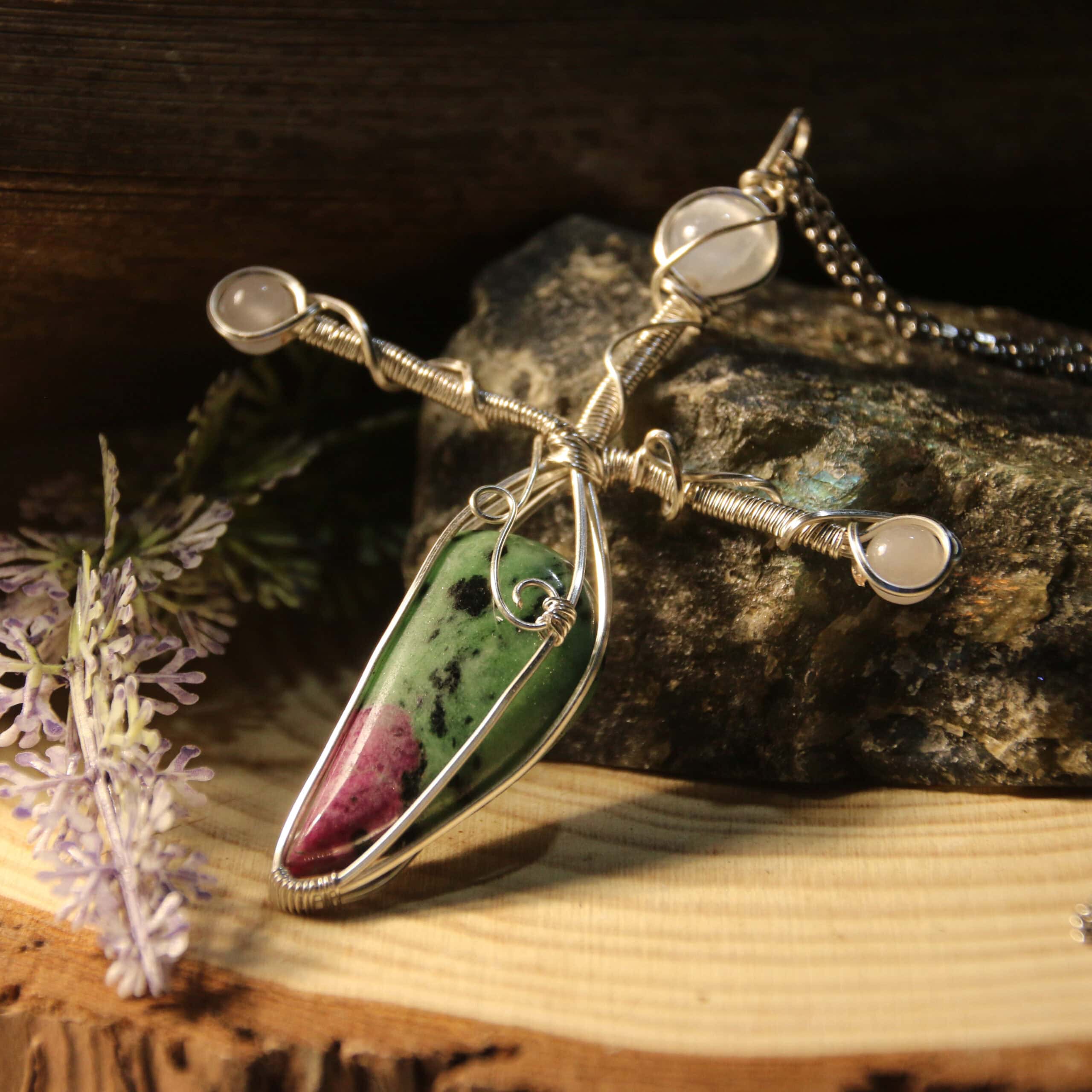 Questa croce in wire wrapping intreccia due energie complementari: la forza concreta del rubino in zoisite, pietra di rigenerazione e coraggio, e la luce sottile della selenite, guida silenziosa verso chiarezza, intuizione e connessione spirituale.