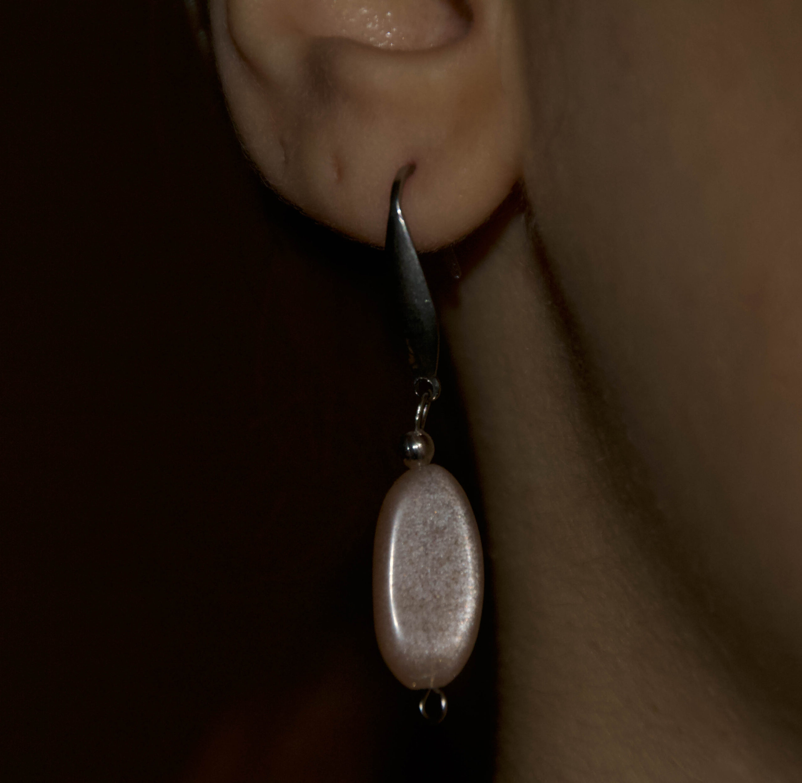 Questi orecchini uniscono una montatura in argento scuro dal profilo moderno a una pietra di luna pesca levigata, caratterizzata da una luce interna morbida e lattiginosa. La forma ovale allunga delicatamente la linea del viso, mentre la montatura sobria mette in primo piano la pietra, lasciando che il suo bagliore rosato emerga a ogni movimento.