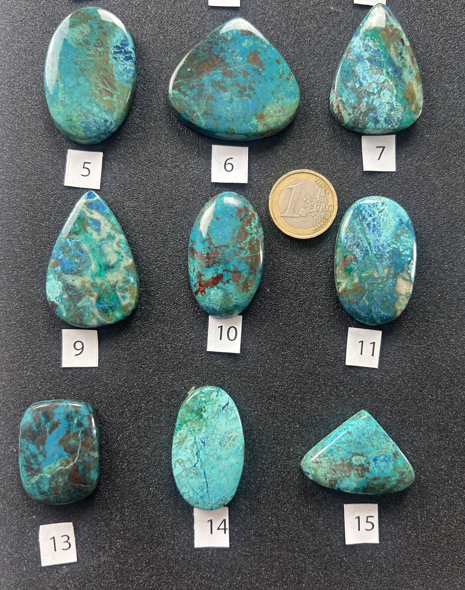 Cabochon di azzurrite-crisocolla naturale, pietra che unisce i toni blu intensi dell’azzurrite ai verdi vibranti della crisocolla. Ogni cabochon presenta una tavolozza unica di sfumature turchesi, rame e malachite, con venature e contrasti che ricordano paesaggi marini o mappe terrestri astratte. Le texture sono vive e dinamiche, con disegni naturali irripetibili.