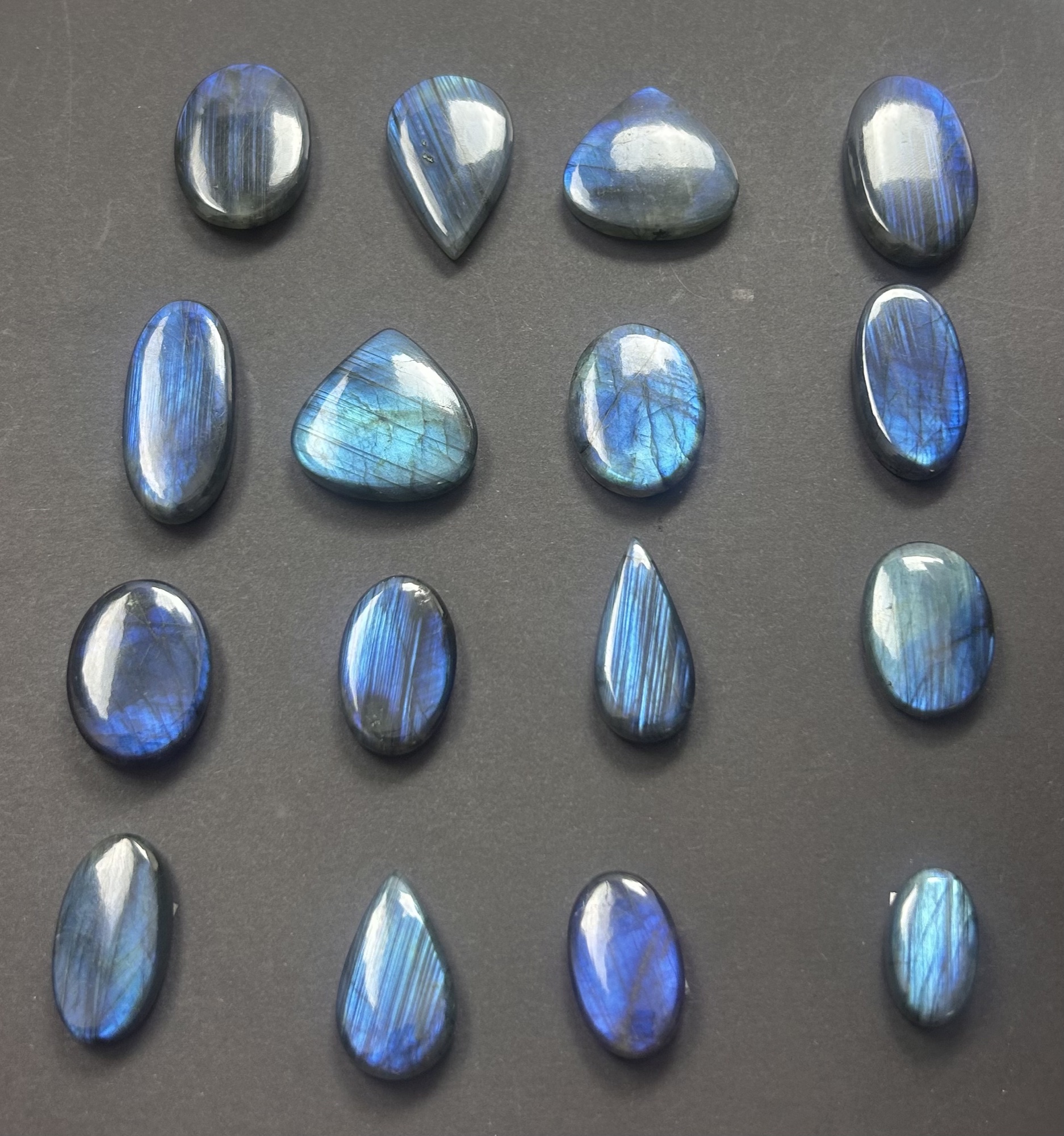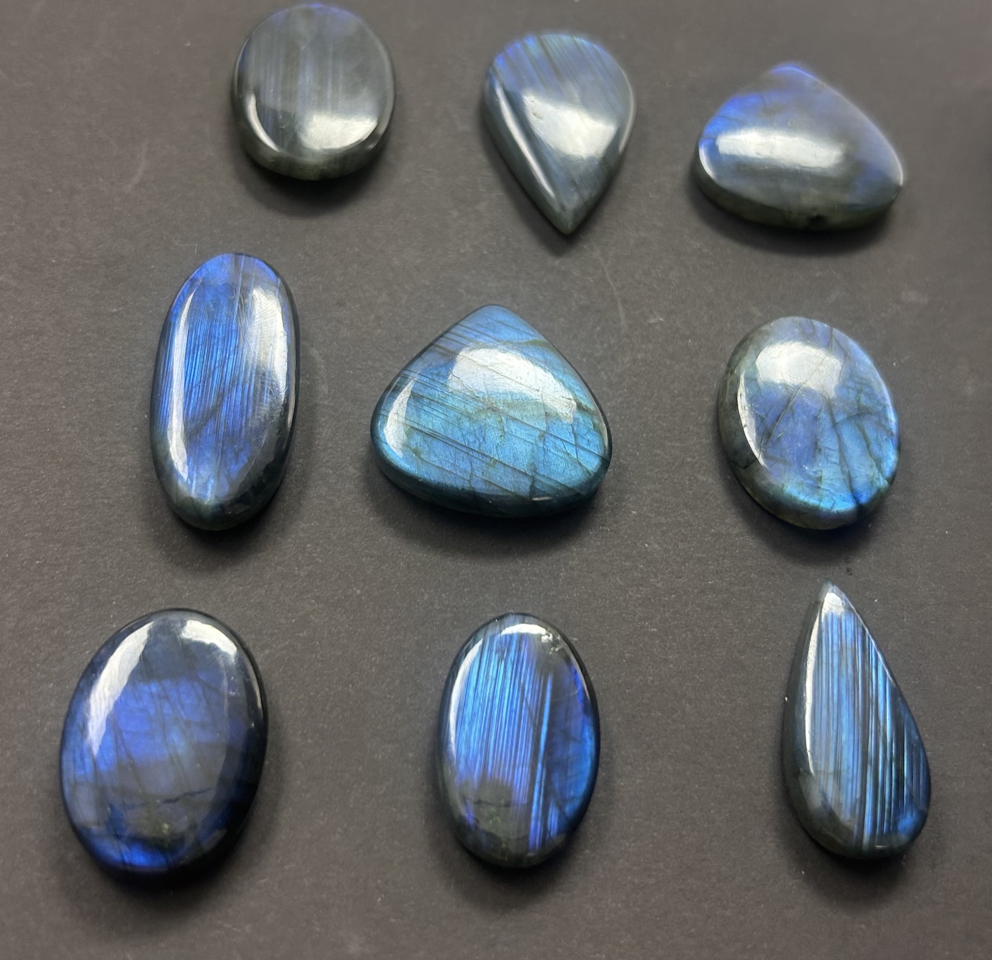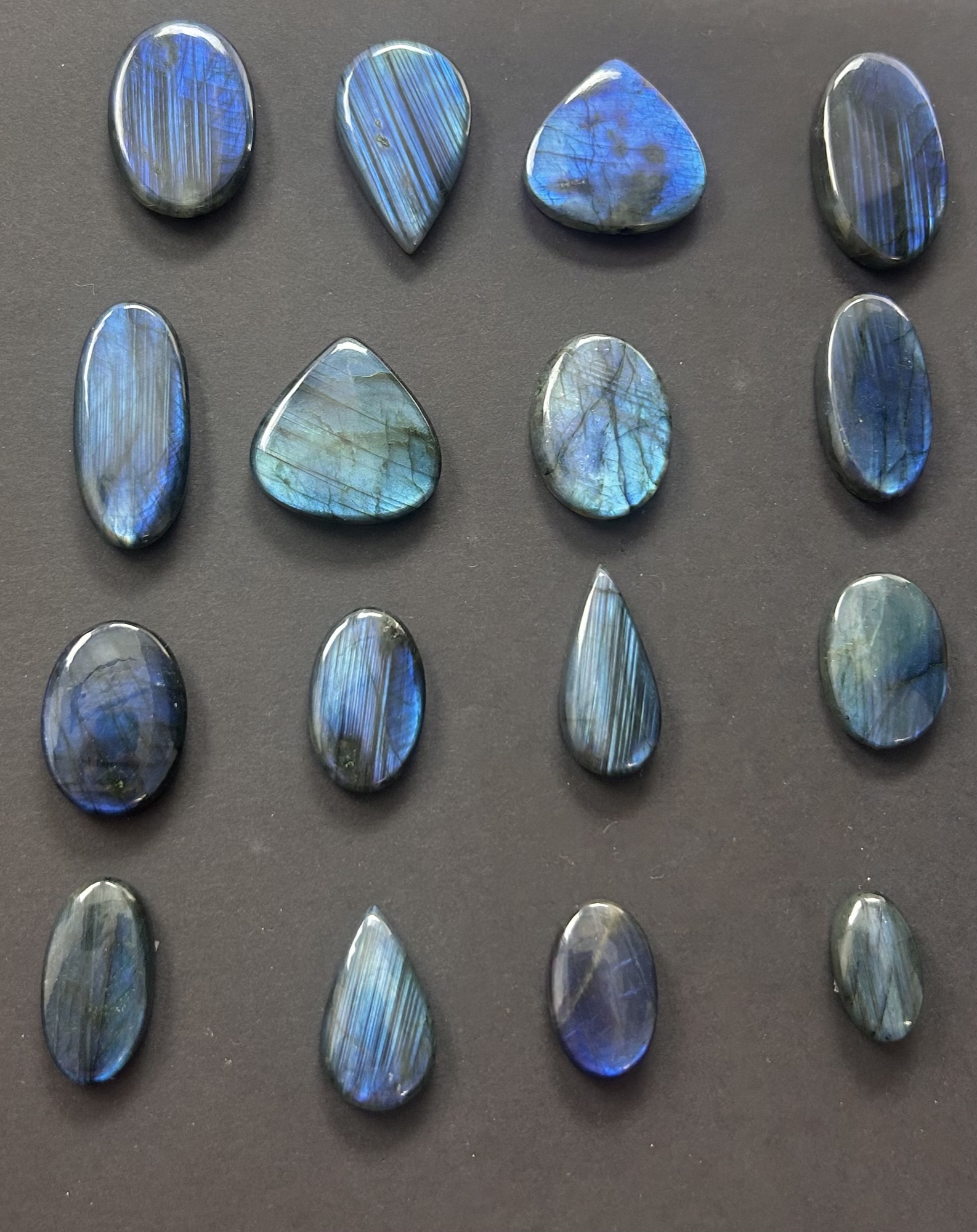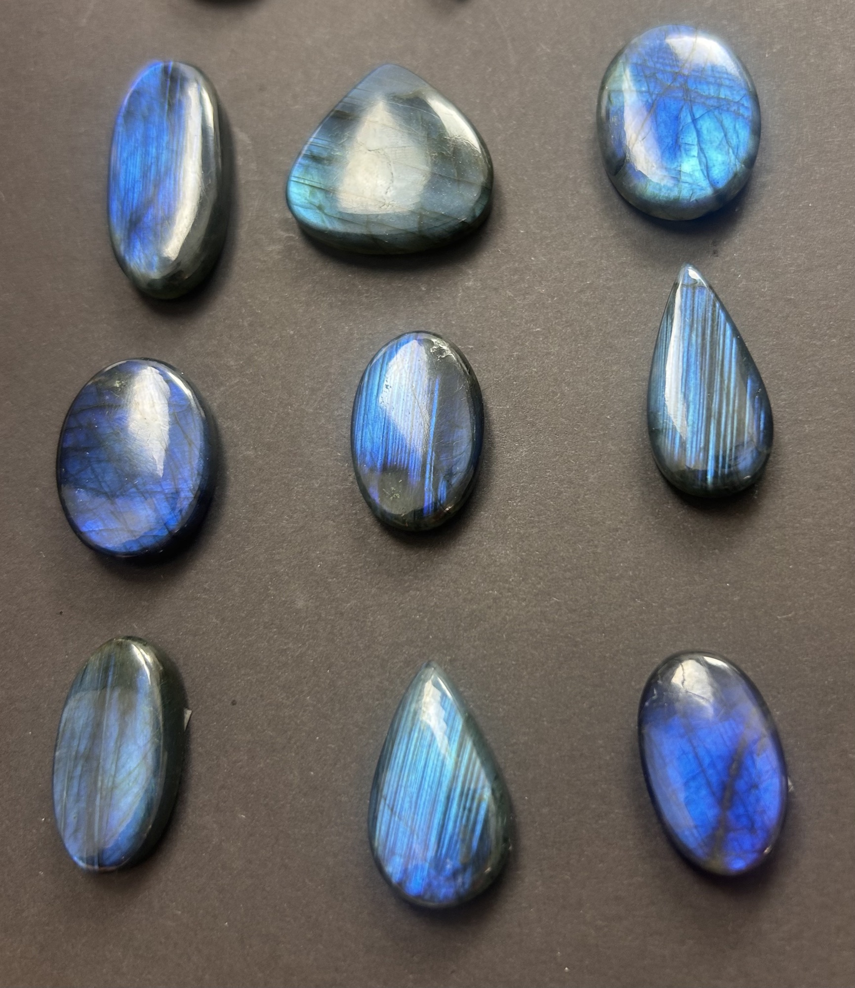Cabochon di labradorite blu naturale, scelti per la loro iridescenza profonda e luminosa, con riflessi che spaziano dal blu elettrico al blu notte. Ogni pietra presenta un gioco di luce unico, con venature e sfumature che cambiano a seconda dell’angolazione, creando un effetto cangiante elegante e magnetico. Le forme includono gocce, ovali e triangoli dalle superfici levigate e compatte.