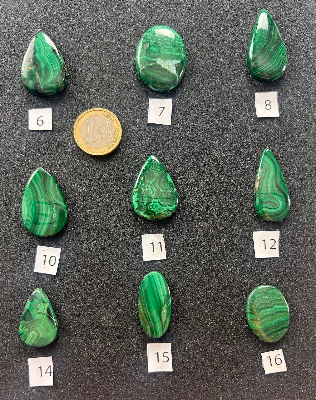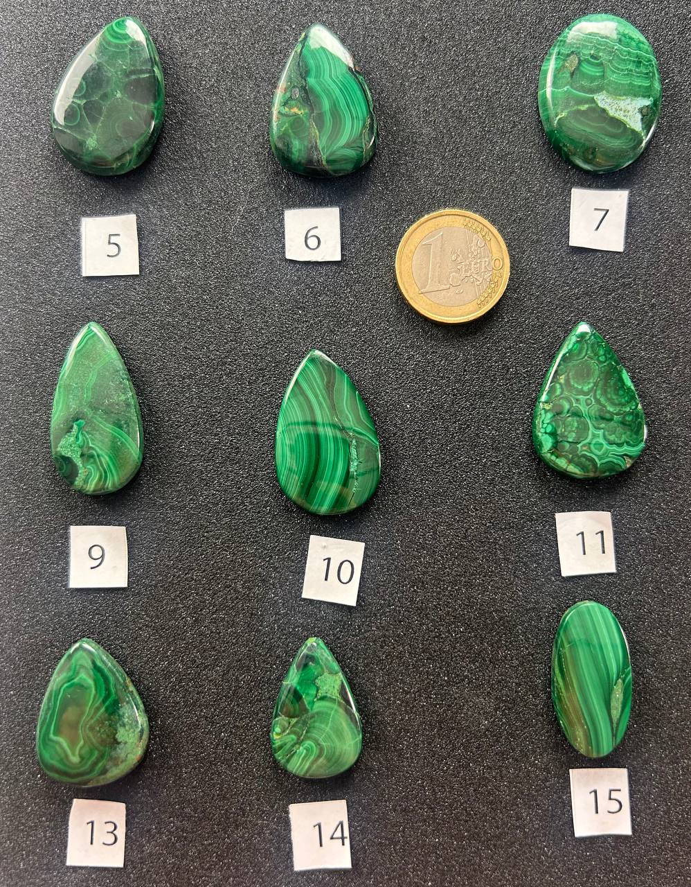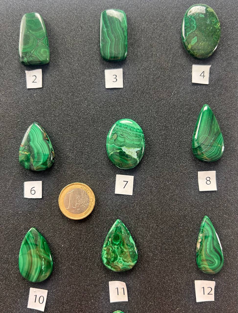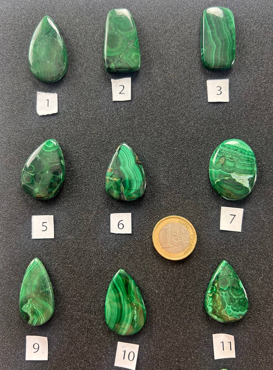 Cabochon di malachite naturale, caratterizzati da intensi toni di verde con venature ondulate e motivi concentrici naturali. Ogni pietra è unica, con disegni che spaziano da linee fluide a orbicolazioni definite, creando affascinanti paesaggi astratti di colore. Le forme comprendono gocce, ovali e rettangoli, ognuna con un equilibrio particolare tra lucentezza e profondità cromatica.
