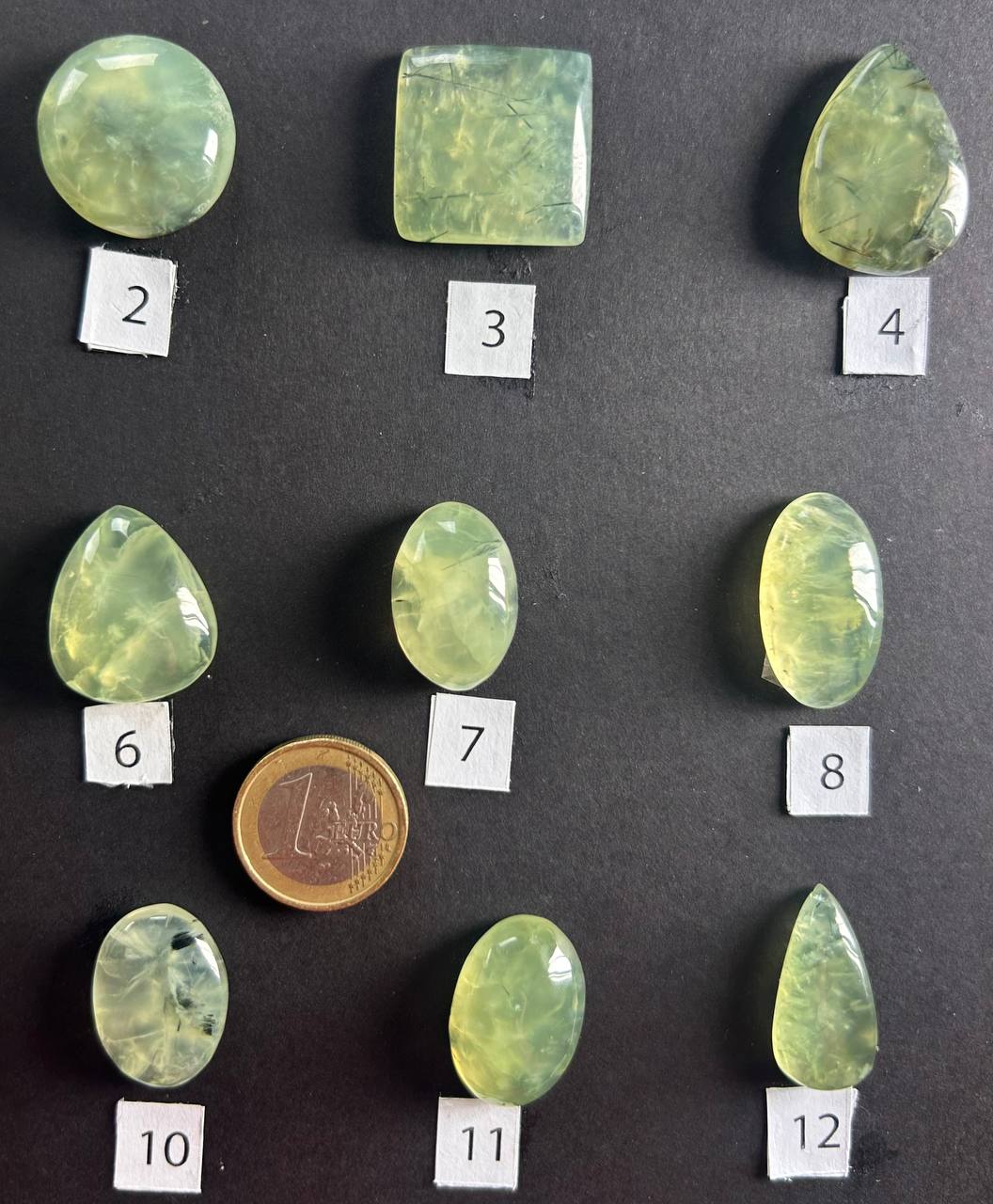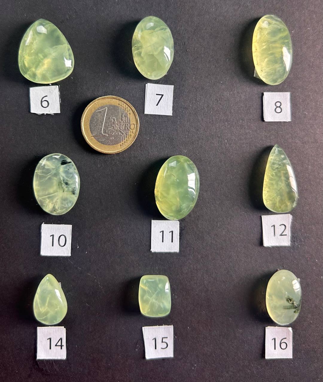 Cabochon di prehnite naturale, caratterizzati da un verde chiaro luminoso con sfumature giallo-verdi e occasionali inclusioni di epidoto che creano affascinanti trame interne. Ogni pietra è semi-trasparente, con una lucentezza morbida e un aspetto vitreo che lascia filtrare la luce, esaltando i giochi di colore e profondità.