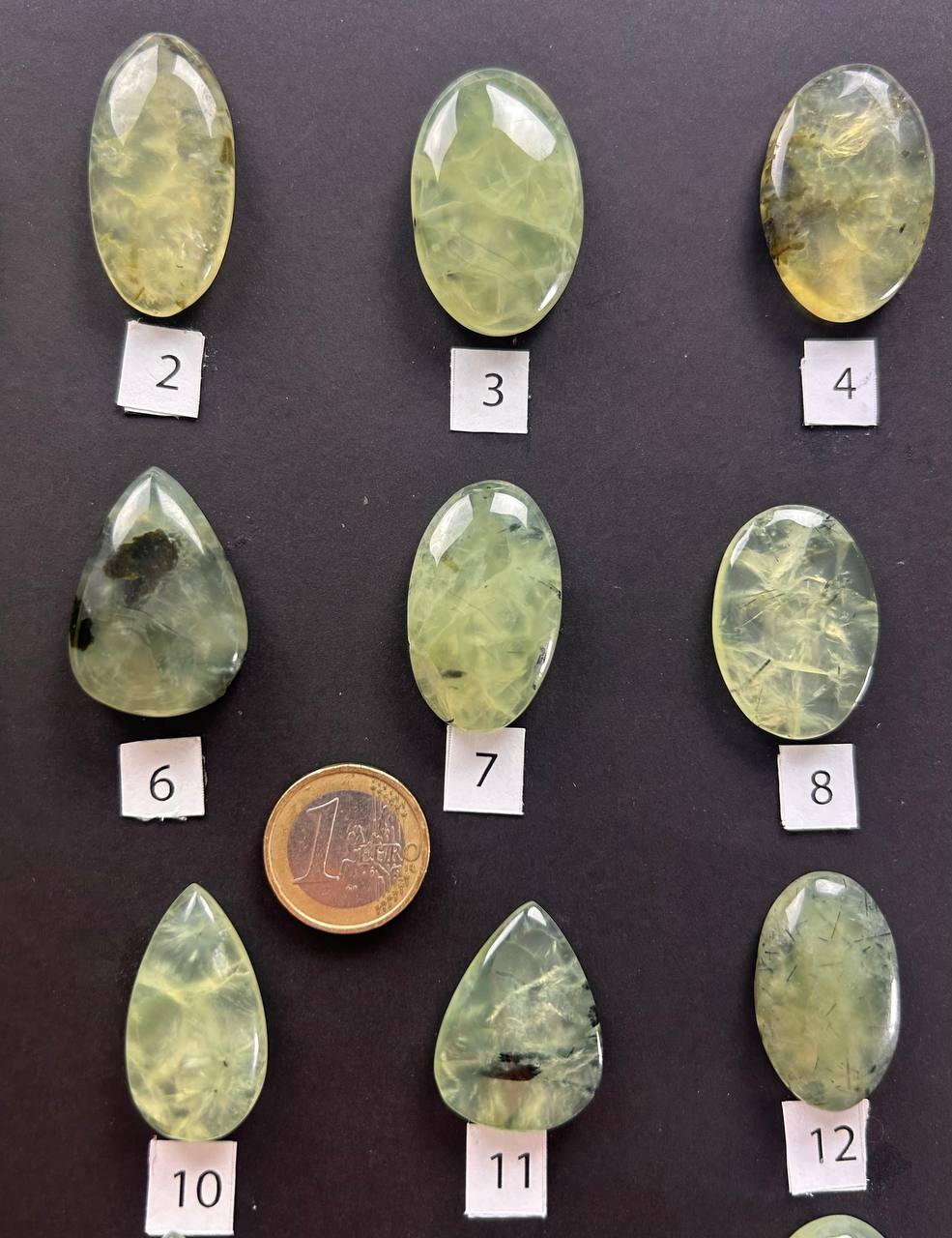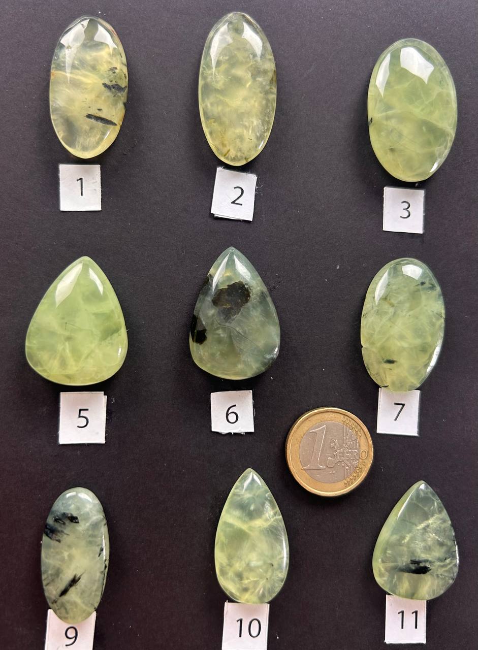 Cabochon di prehnite naturale, con tonalità che spaziano dal verde chiaro al verde-giallo traslucido, arricchite da eleganti inclusioni di epidoto nero o grigio che creano venature e giochi di profondità unici. Alcuni esemplari presentano un aspetto lattiginoso e delicato, altri una trasparenza più vivida e cristallina.