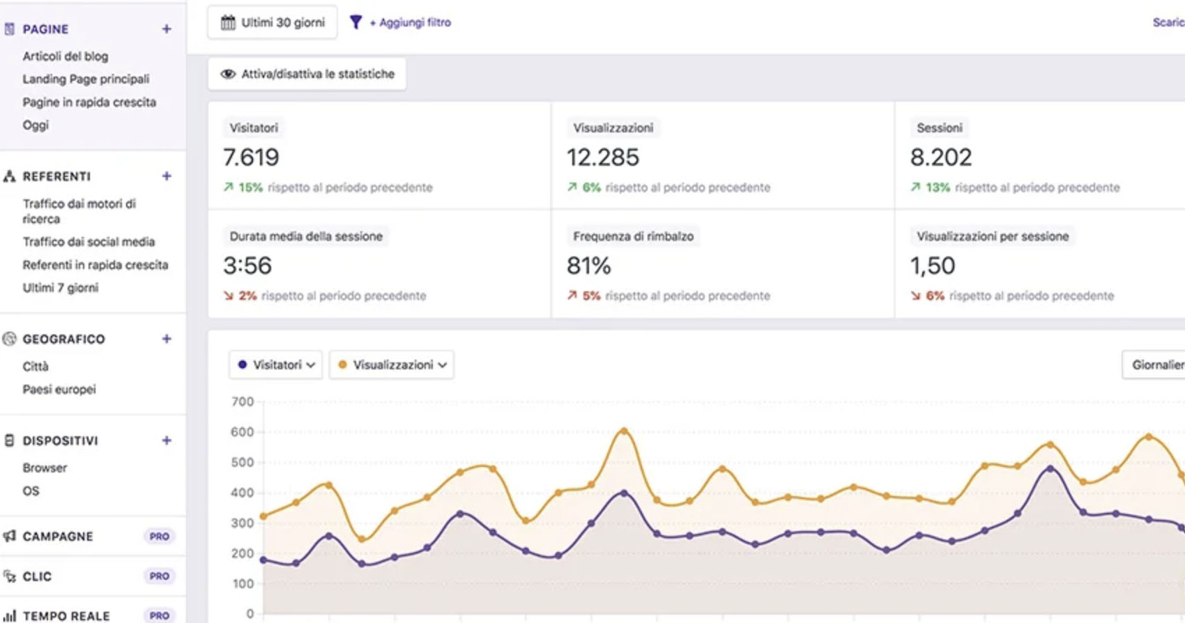 Con strumenti come Independent Analytics o Ubersuggest puoi monitorare facilmente crescita e traffico.
